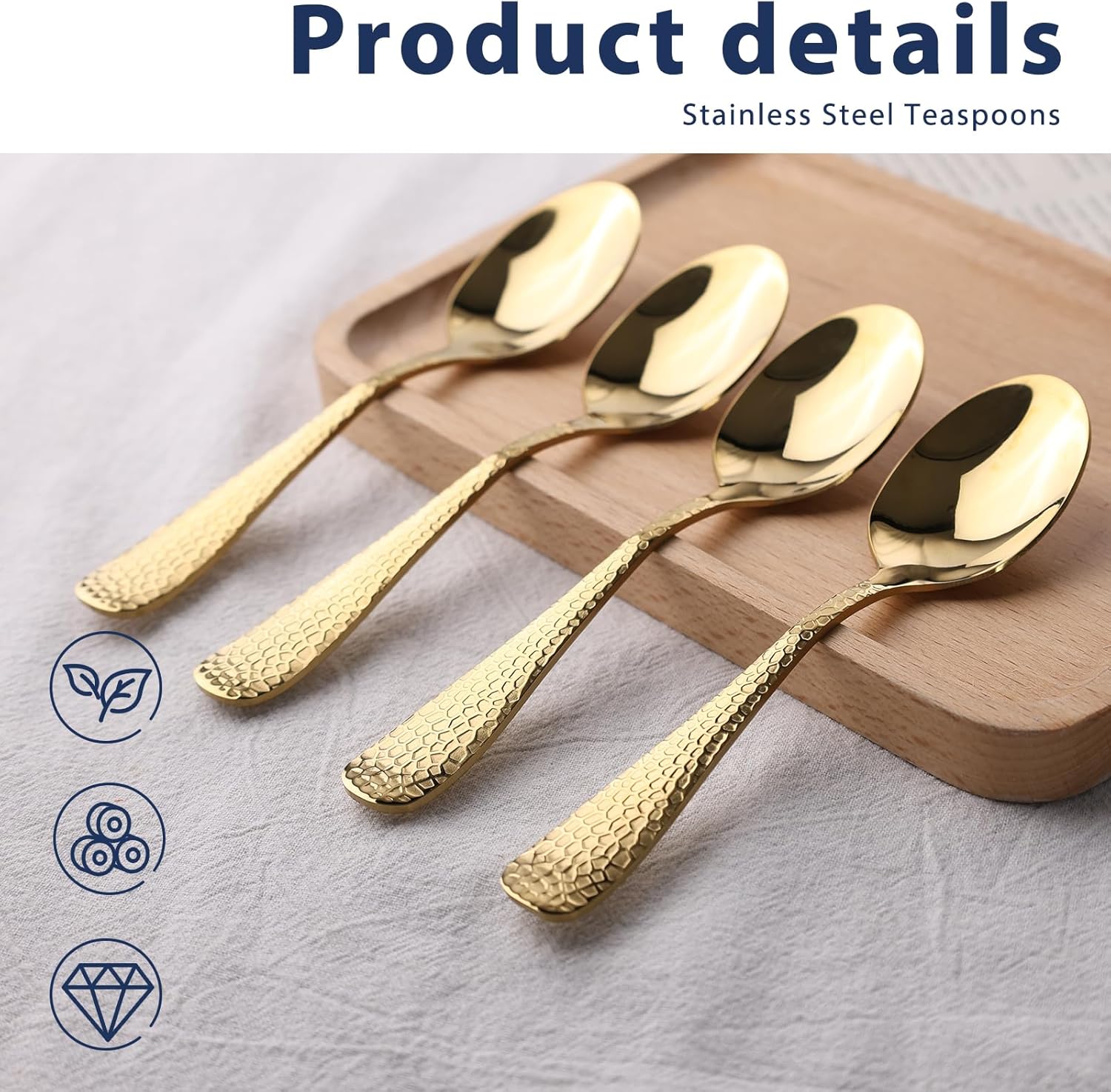 For some reason I was low in spoons. This seemed to be a good deal. I use a lot of spoons, so I ordered them. They arrived in good time. They have a gold color, I hope it stays that way. I use my dishwasher to wash them. Are sturdy and feel good to use. A bit shorter than my regular ones but not so much at to be a problem. So far a good purchase.